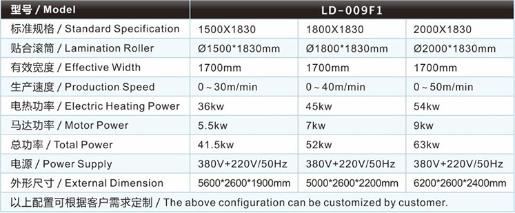| 熱熔膜復合機/貼合機LD-009F1 主要技術(shù)參數(shù) / Major technical parameters |