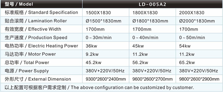 | 強(qiáng)力膠復(fù)合機(jī)/貼合機(jī)-EVA強(qiáng)力膠復(fù)合機(jī)/貼合機(jī)LD-005A2的主要技術(shù)參數(shù) / Major technical parameters |